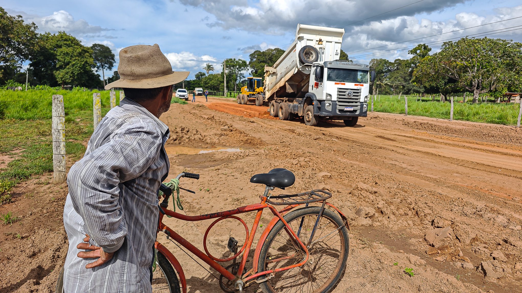 Legenda: O pequeno produtor rural Francisco Balbino acompanhando a melhoria da estrada