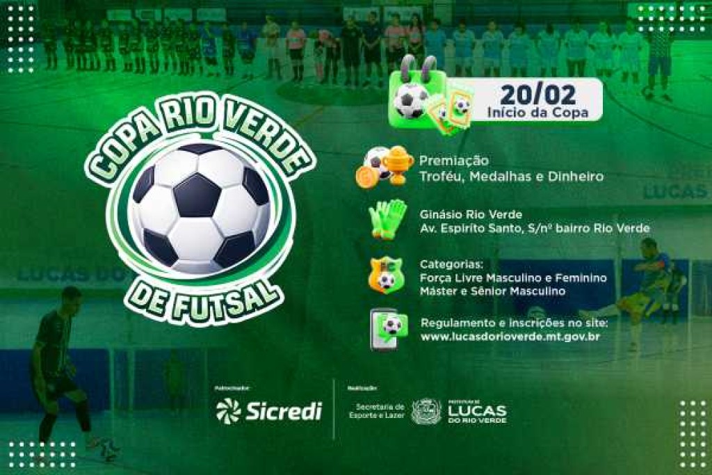 A Prefeitura de Lucas do Rio Verde, por meio da Secretaria de Esporte e Lazer, abrirá na próxima terça-feira (20) as inscrições para a Copa Rio Verde de Futsal. A competição conta com apoio da Sicredi Ouro Verde e é aberta a equipes do município e de outras localidades.