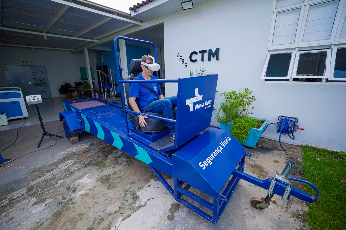Na sequência, os motoristas utilizaram um simulador de impacto que reproduz, em ambiente controlado e em baixa velocidade, a dinâmica de um acidente de trânsito, demonstrando a importância vital do uso do cinto de segurança. A experiência contou com o uso de óculos de realidade virtual, que criou um cenário imersivo e realista, evidenciando os perigos do uso do celular ao volante.