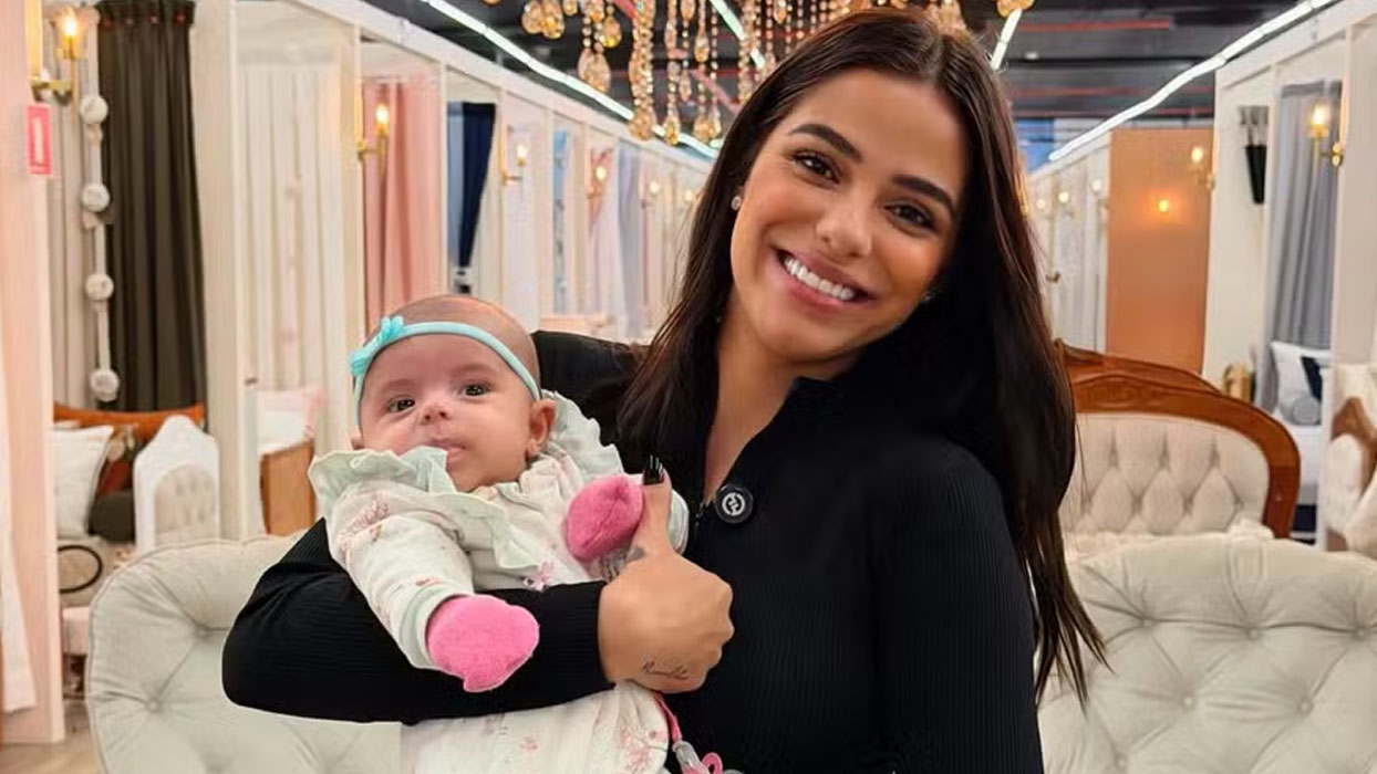 Na imagem, a ex-BBB aparece sorridente segurando a bebê no colo em um ambiente elegante, decorado com sofás e um grande lustre ao fundo. O momento chamou a atenção dos fãs, que rapidamente deixaram elogios nos comentários da publicação.
