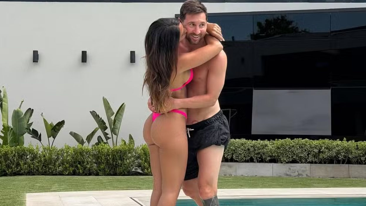 Messi e Antonela Roccuzzo posam em clima de romance em dia de piscina: ‘Espectaculo’