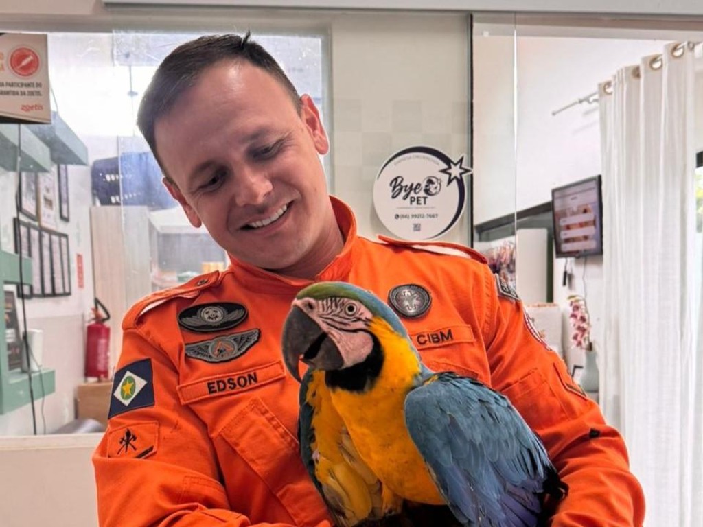 Corpo de Bombeiros resgata arara-canindé em indústria de carne suína