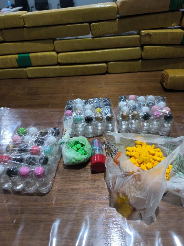 Dentro das caixas, os militares localizaram 127 tabletes de maconha, cinco tabletes de skank, 180 comprimidos de ecstasy, 100 frascos contendo líquido semelhante à cocaína líquida e duas cartelas com cerca de 100 unidades aparentando ser LSD. Os policiais ainda encontraram uma porção de substância análoga à cocaína dentro da capa do celular do suspeito, que assumiu ser o proprietário.