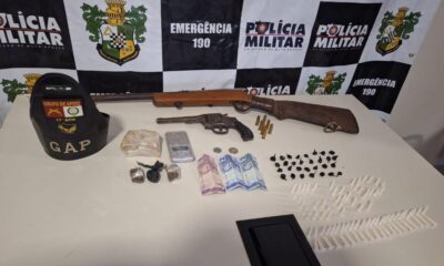 Policiais militares do 17º Batalhão prenderam um homem, por porte ilegal de arma de fogo e tráfico ilícito de drogas, nesta segunda-feira (16.2), em Lambari D’Oeste....